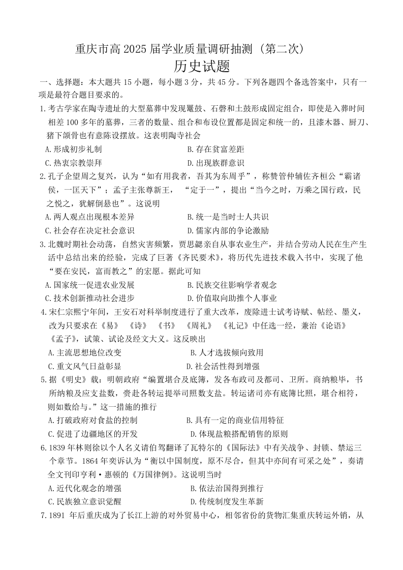 重庆市主城五区2024-2025学年下学期高三二诊质量调研抽测历史