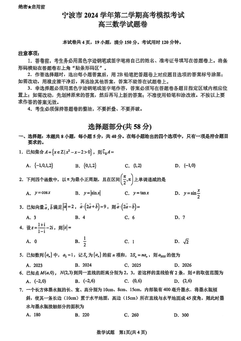 浙江省宁波市2024-2025学年下学期4月高三高考二模考试数学+答案