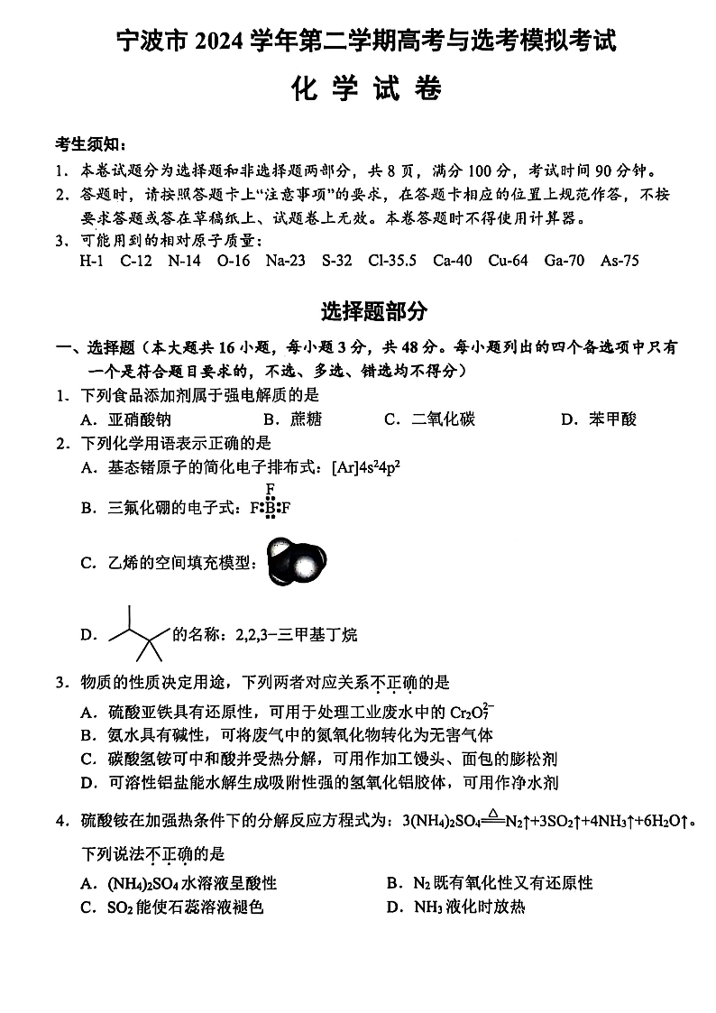 浙江省宁波市2024-2025学年下学期4月高三高考二模考试化学+答案