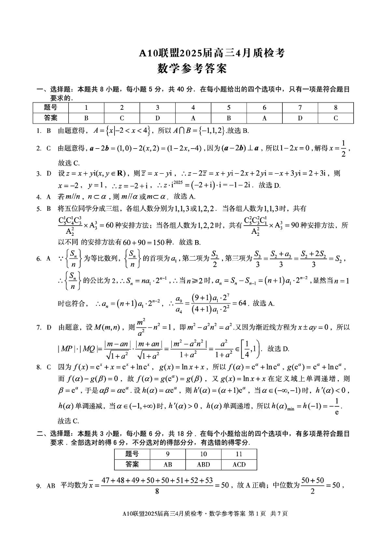 安徽省A10联盟2024-2025学年下学期4月高三质检考数学答案