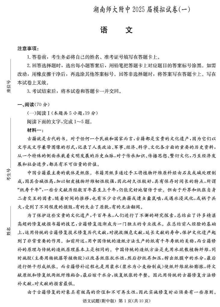 湖南省师大附中2024-2025学年下学期4月高三模拟(一)语文