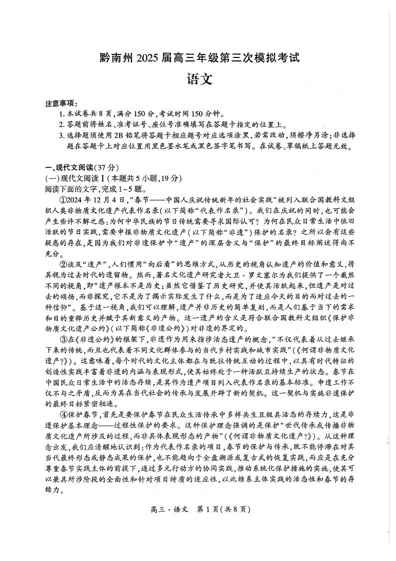 贵州省黔南州2024-2025学年下学期高三三模考试语文