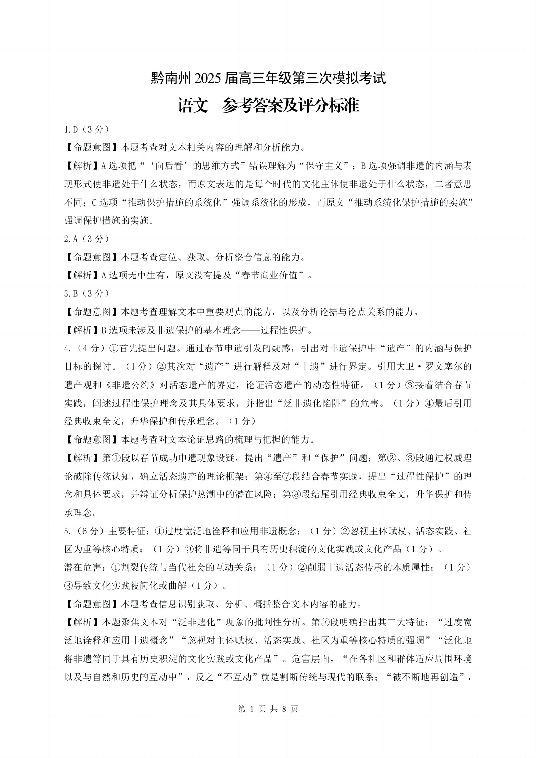 贵州省黔南州2024-2025学年下学期高三三模考试语文答案