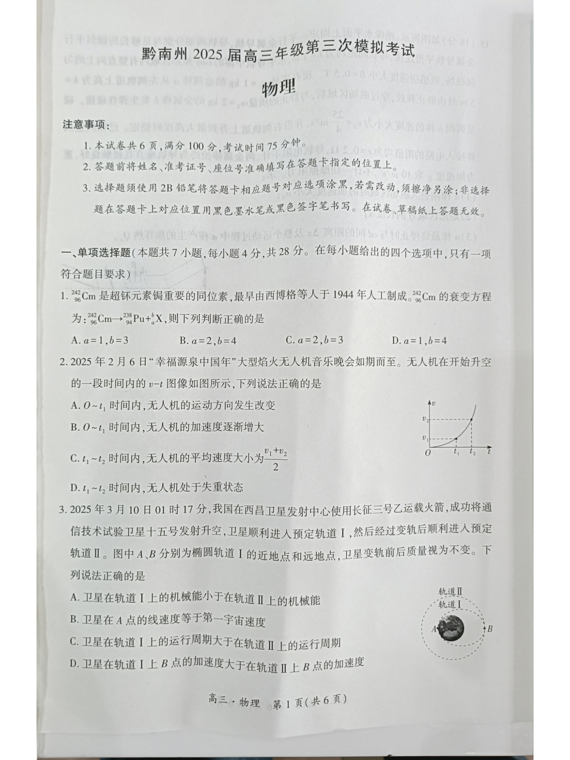贵州省黔南州2024-2025学年下学期高三三模考试物理