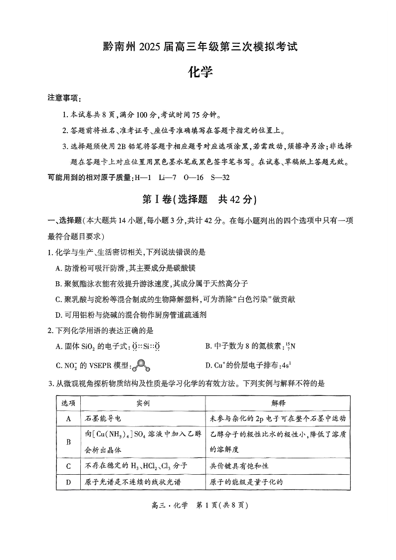 贵州省黔南州2024-2025学年下学期高三三模考试化学