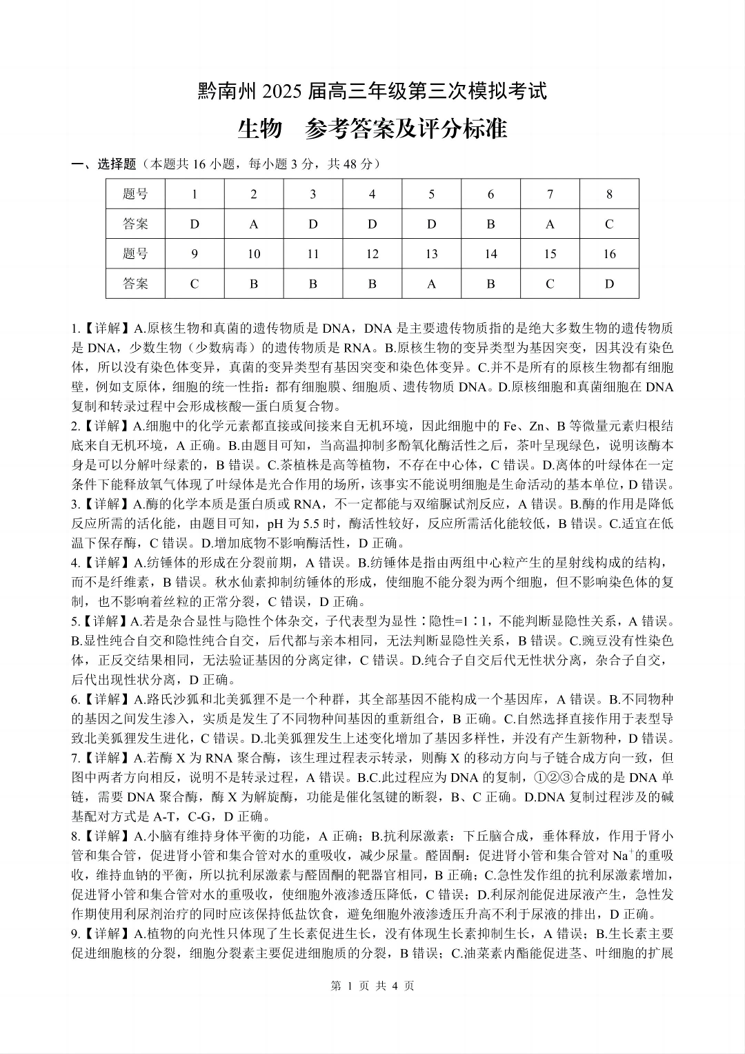 贵州省黔南州2024-2025学年下学期高三三模考试生物答案