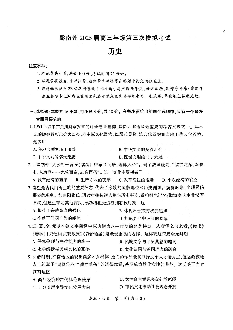 贵州省黔南州2024-2025学年下学期高三三模考试历史