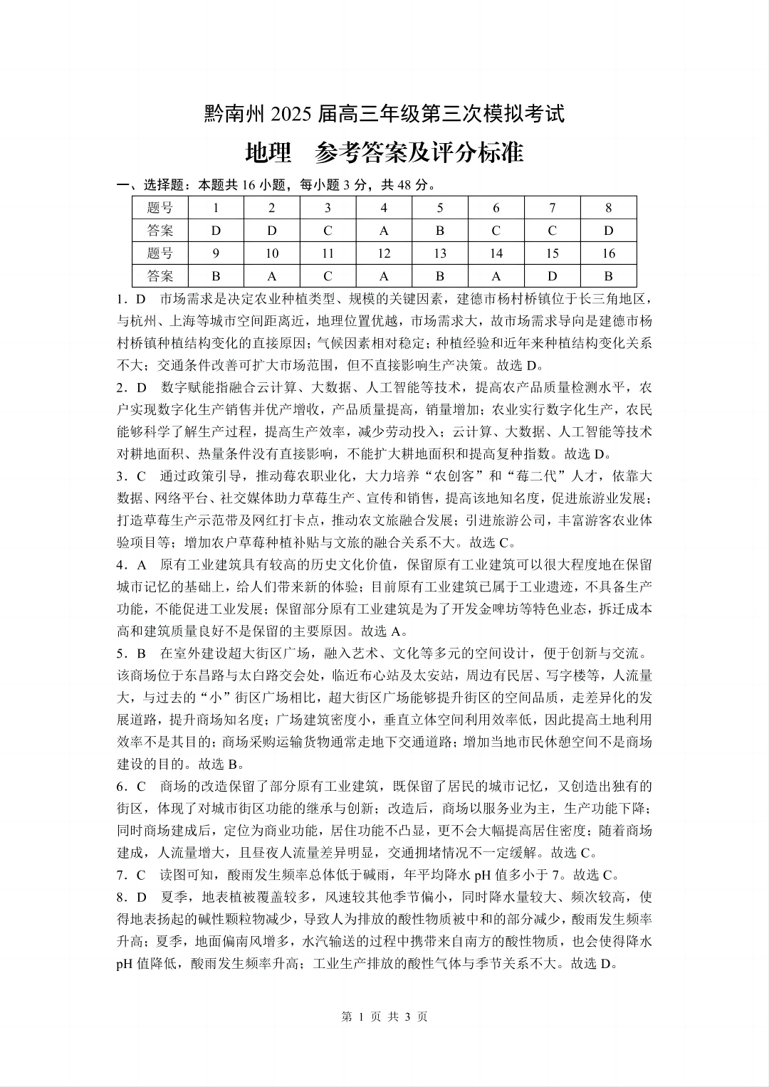 贵州省黔南州2024-2025学年下学期高三三模考试地理答案