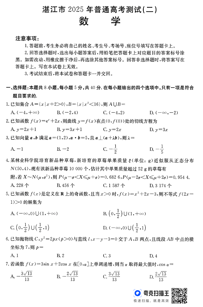 广东省湛江市2024- 2025 学年下学期高三普通高考二模测试数学+答案