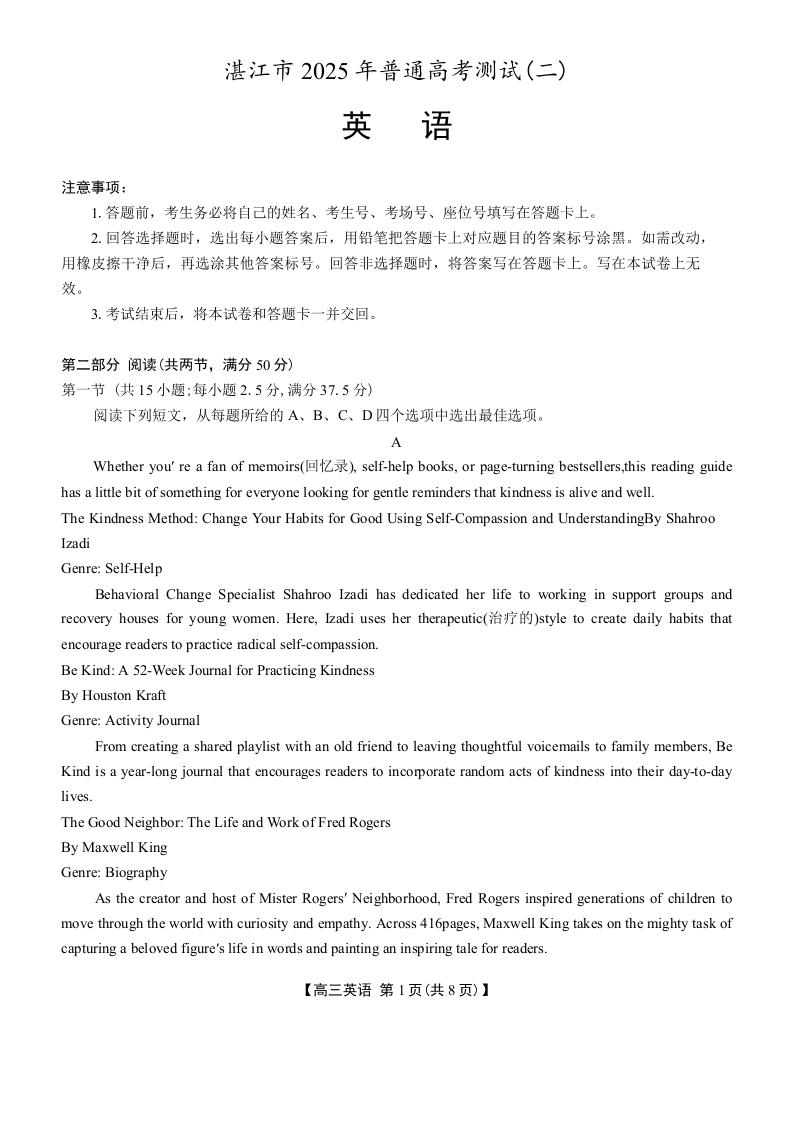 广东省湛江市2024- 2025 学年下学期高三普通高考二模测试英语+答案