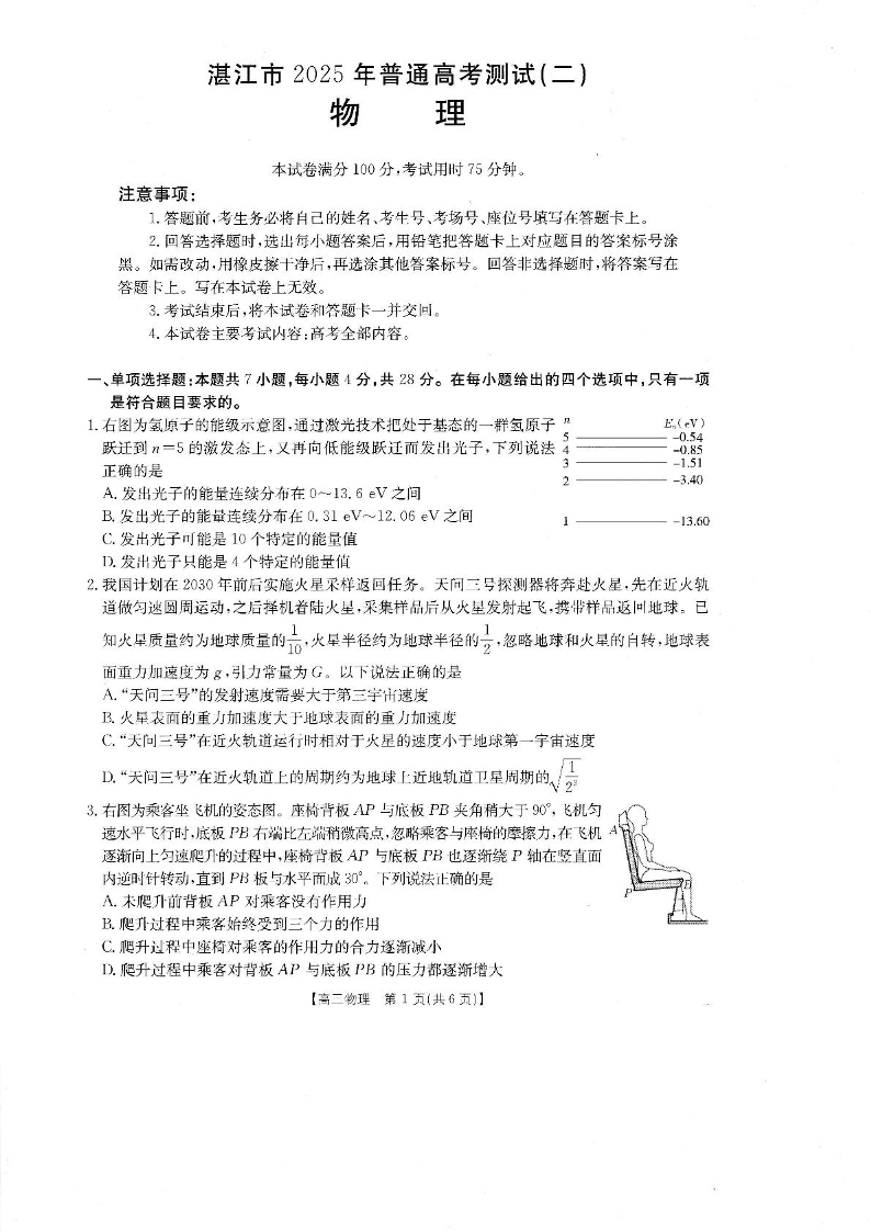 广东省湛江市2024- 2025 学年下学期高三普通高考二模测试物理