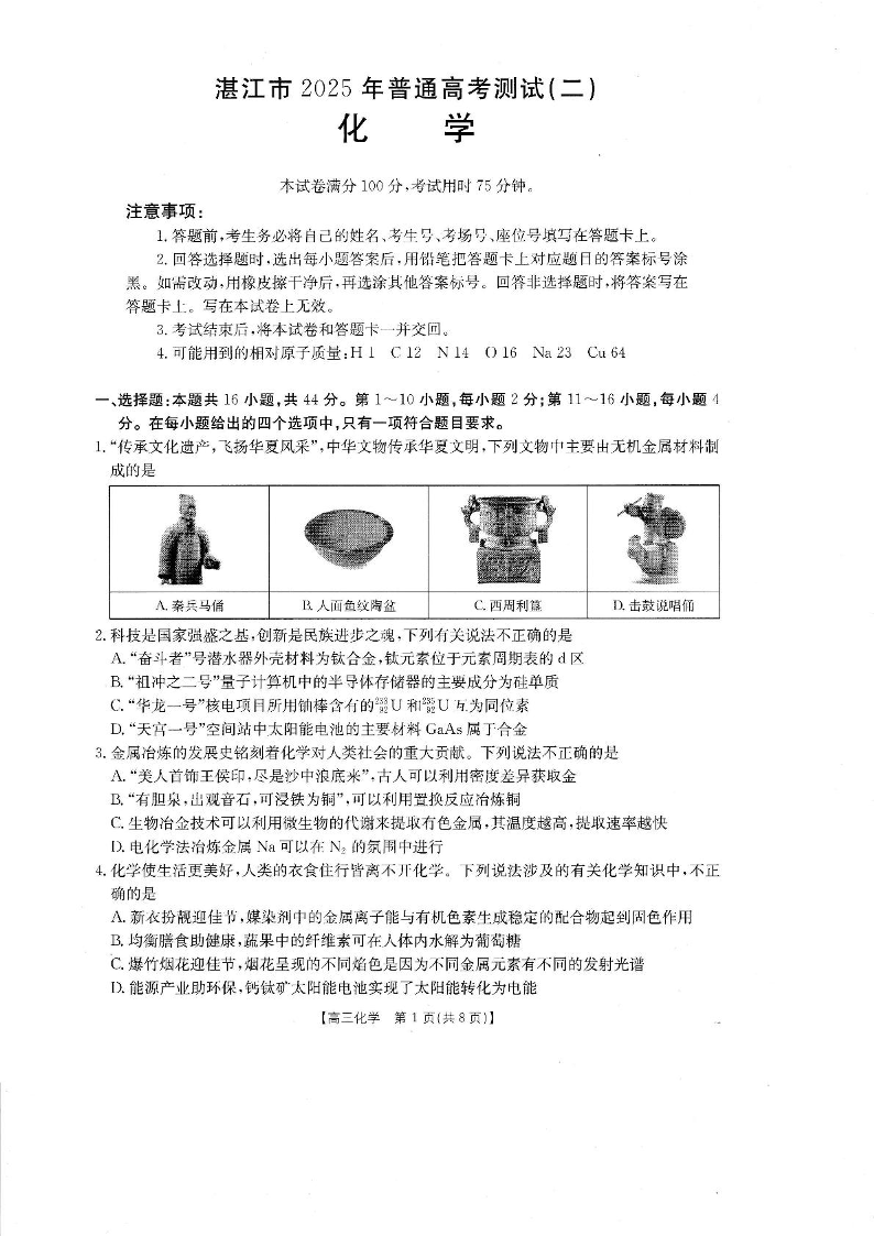 广东省湛江市2024- 2025 学年下学期高三普通高考二模测试化学