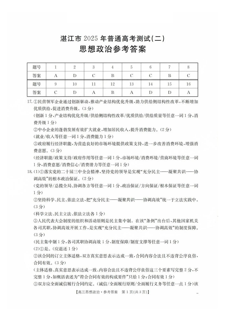 广东省湛江市2024- 2025 学年下学期高三普通高考二模测试政治答案