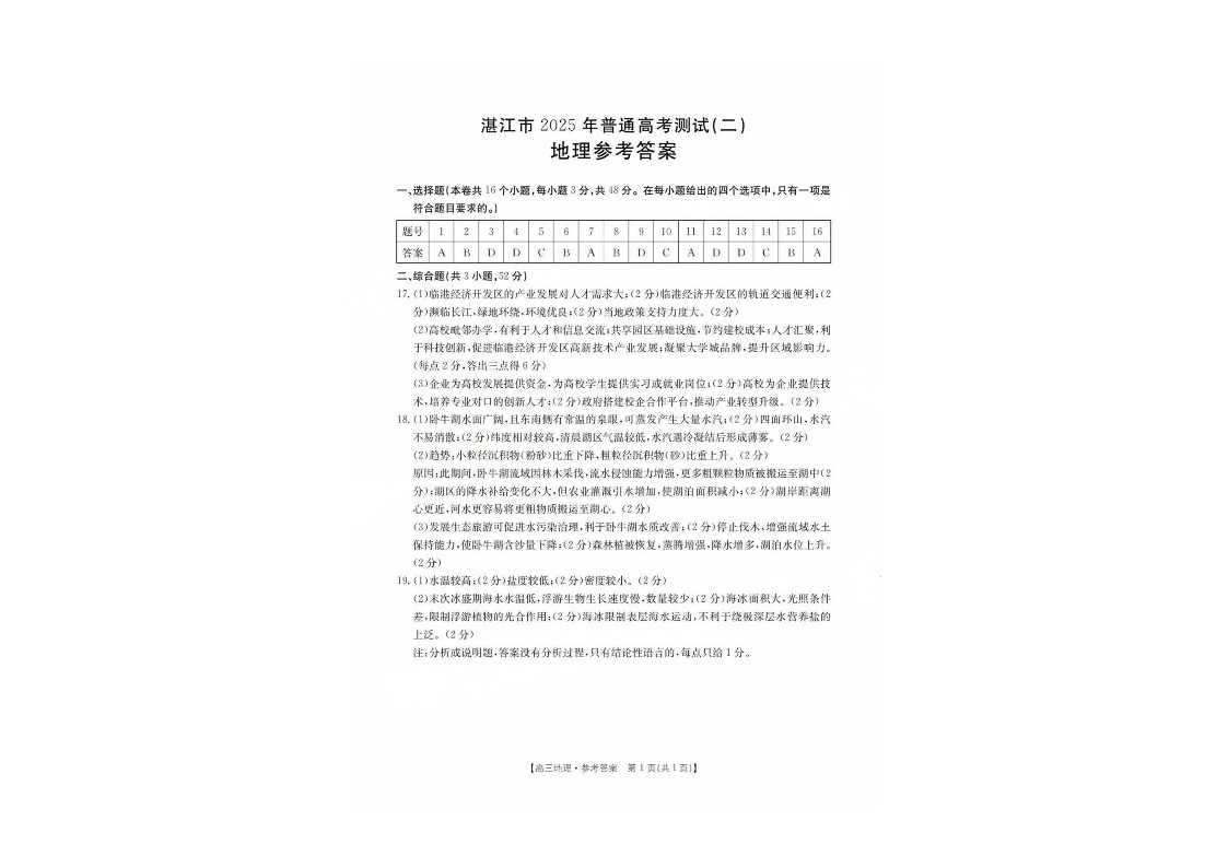 广东省湛江市2024- 2025 学年下学期高三普通高考二模测试地理答案