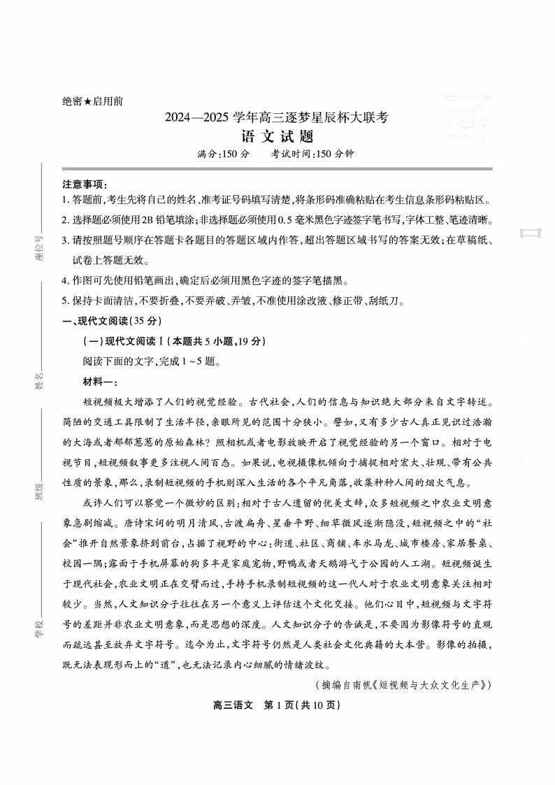 安徽省鼎尖教育2024-2025学年下学期4月高三逐梦杯实验班联考语文