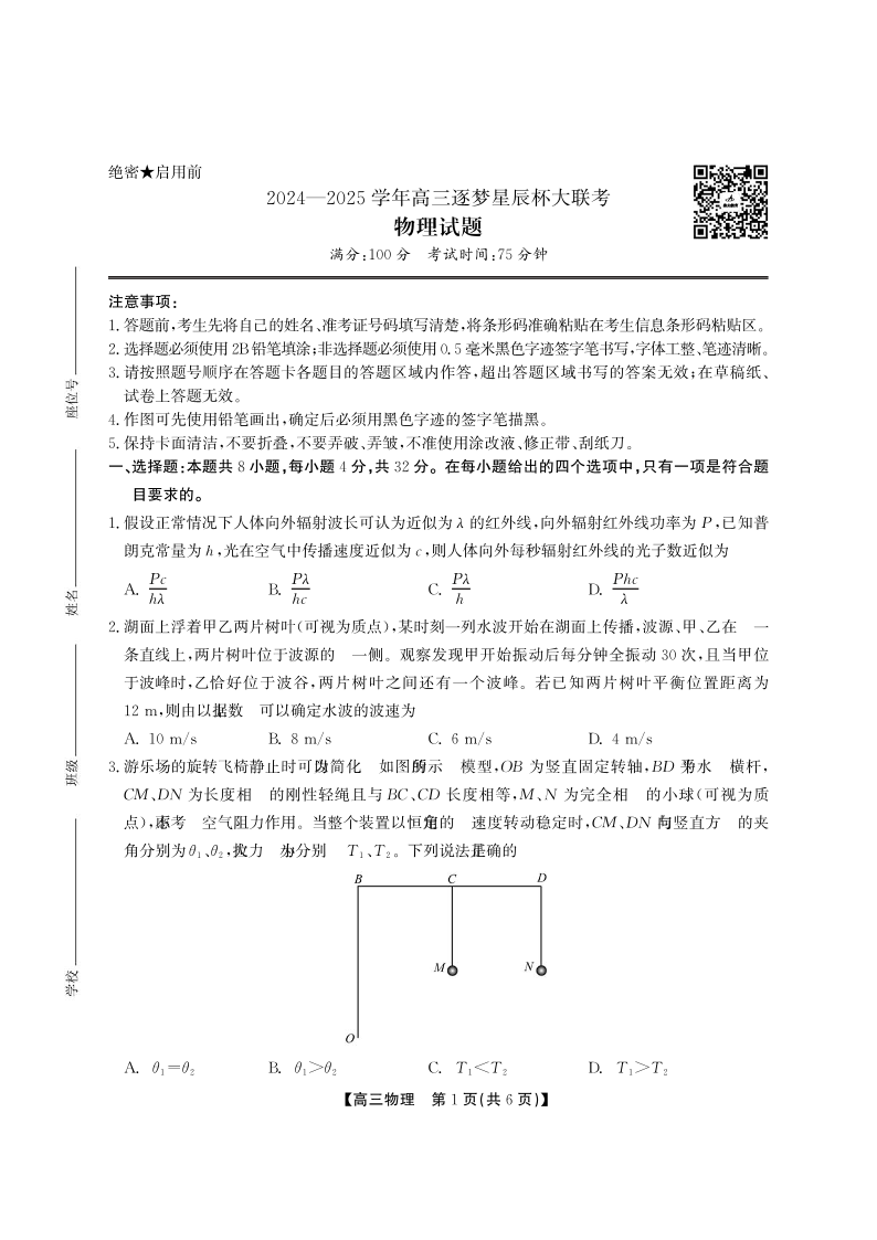 安徽省鼎尖教育2024-2025学年下学期4月高三逐梦杯实验班联考物理