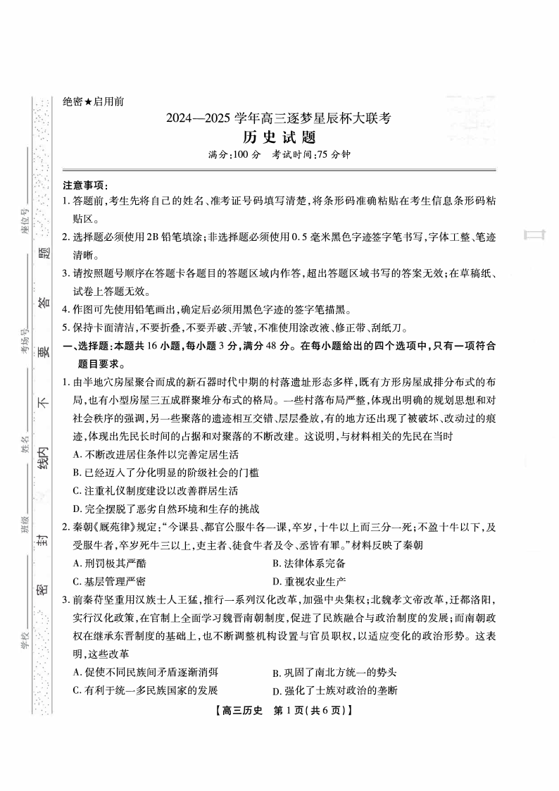 安徽省鼎尖教育2024-2025学年下学期4月高三逐梦杯实验班联考历史