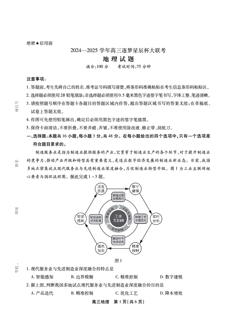 安徽省鼎尖教育2024-2025学年下学期4月高三逐梦杯实验班联考地理