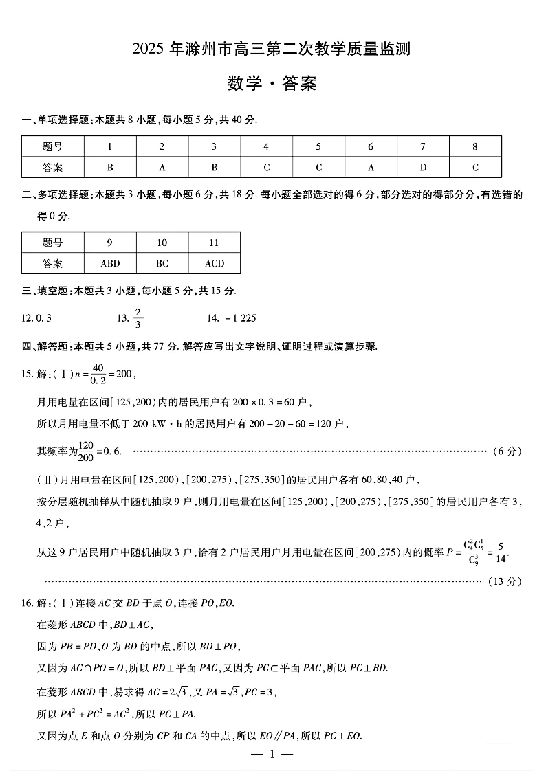 安徽省滁州市2024-2025学年下学期高三二模教学质量监测数学答案