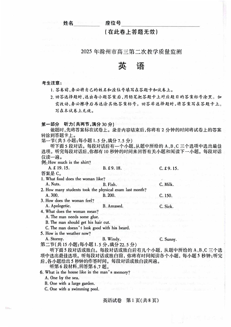 安徽省滁州市2024-2025学年下学期高三二模教学质量监测英语+答案