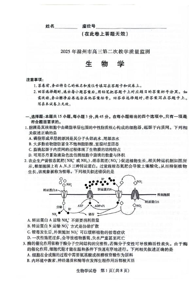 安徽省滁州市2024-2025学年下学期高三二模教学质量监测生物