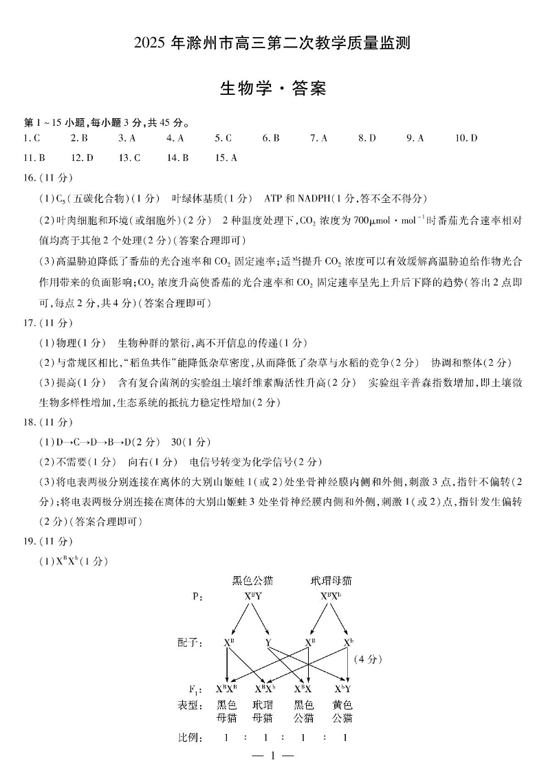 安徽省滁州市2024-2025学年下学期高三二模教学质量监测生物答案