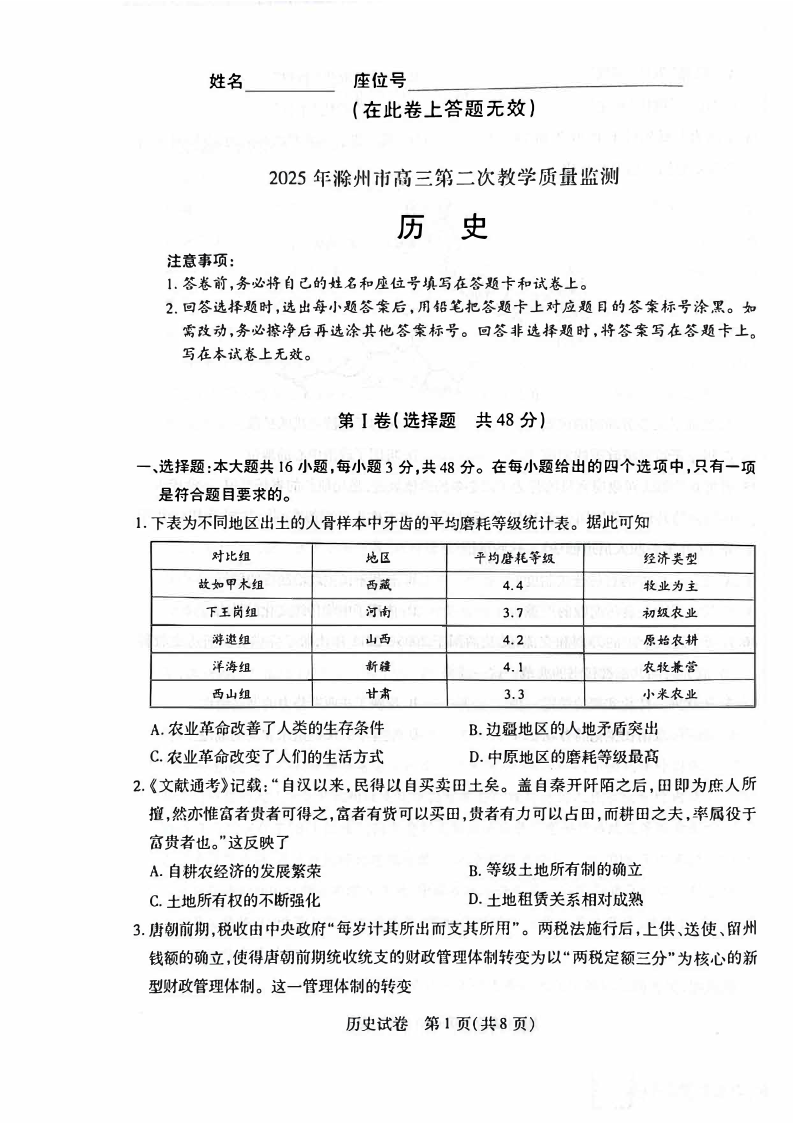 安徽省滁州市2024-2025学年下学期高三二模教学质量监测历史+答案