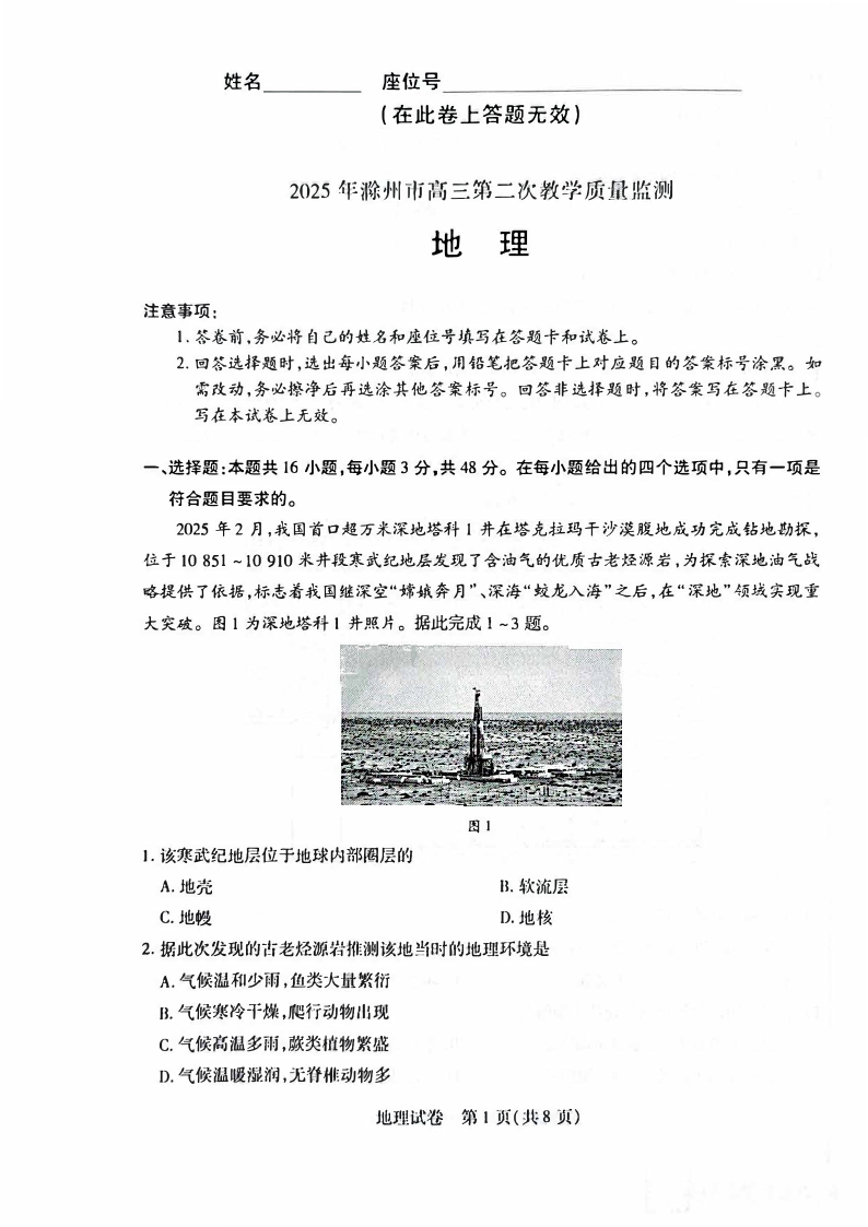安徽省滁州市2024-2025学年下学期高三二模教学质量监测地理+答案