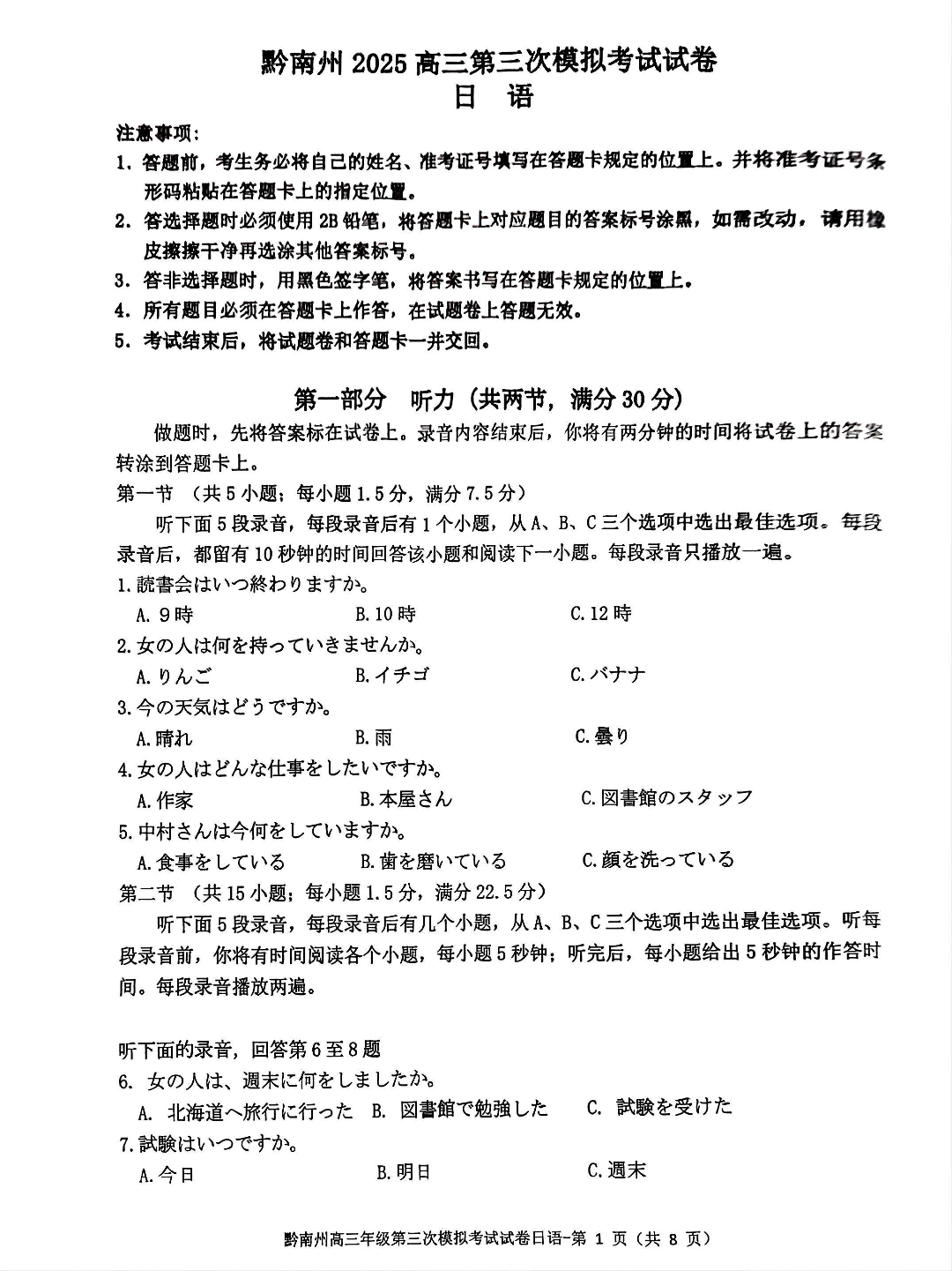 贵州省黔南州2024-2025学年下学期高三三模考试日语