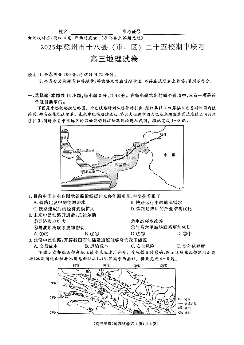 江西省赣州市2024-2025学年下学期高三期中联考地理