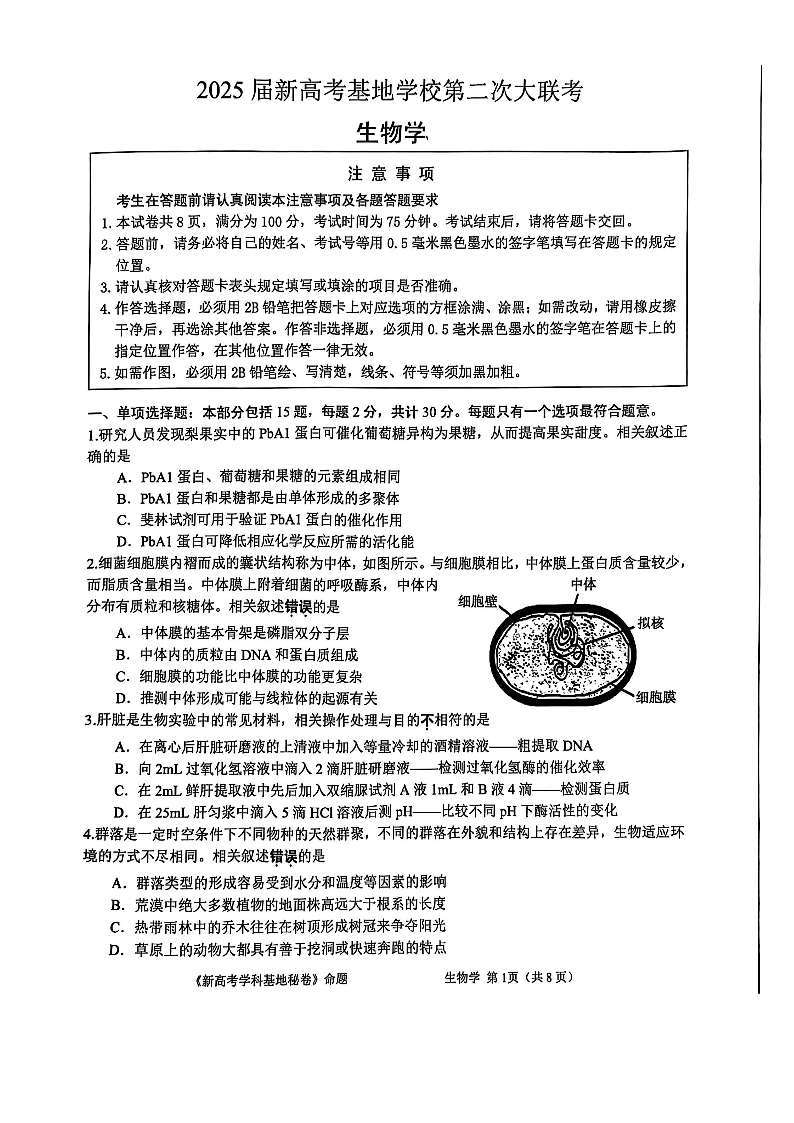 江苏省新高考基地学校2024-2025学年下学期高三联考二生物+答案