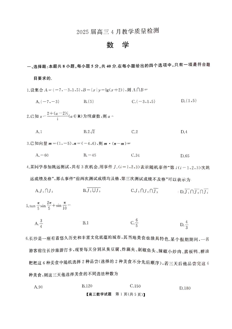 湖南省娄底市2024-2025学年下学期4月高三二模联考数学