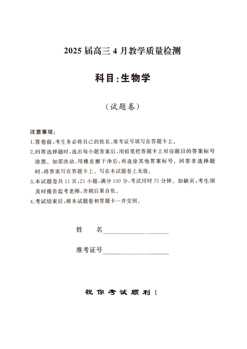湖南省娄底市2024-2025学年下学期4月高三二模联考生物