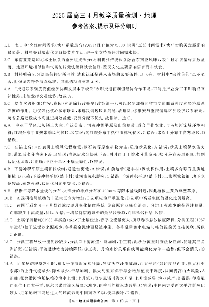 湖南省娄底市2024-2025学年下学期4月高三二模联考地理答案
