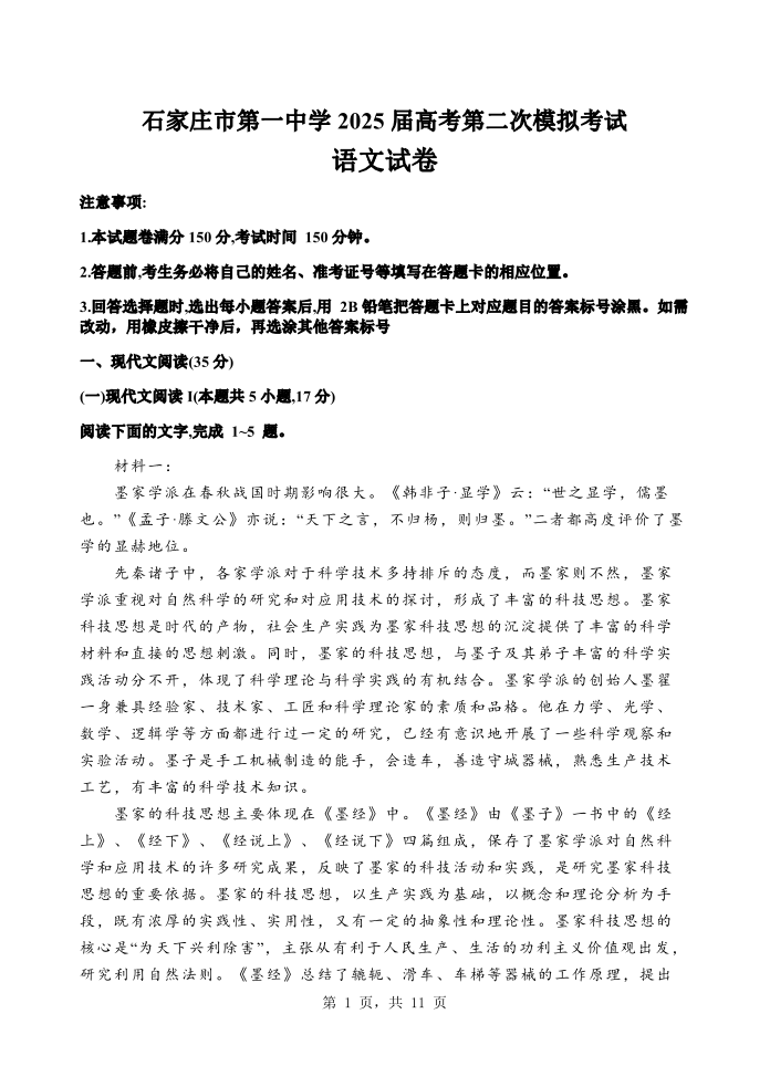 河北省石家庄市一中2024-2025学年下学期高三第二次模拟语文