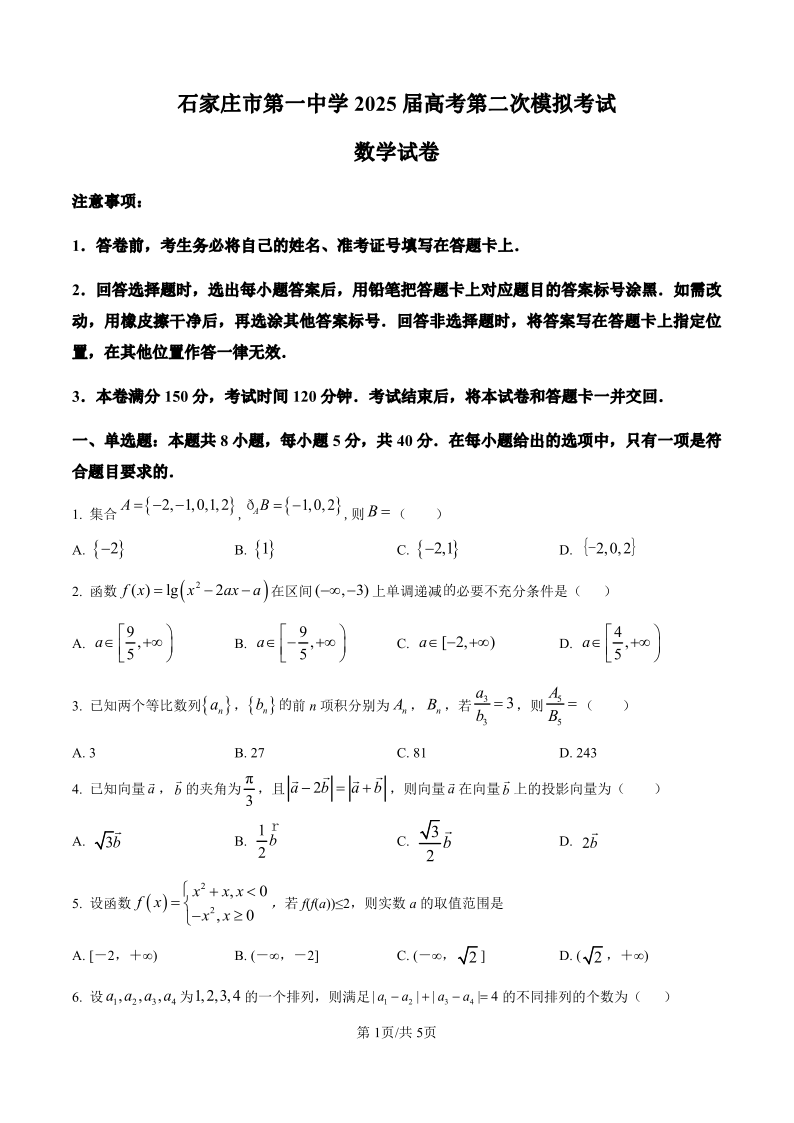 河北省石家庄市一中2024-2025学年下学期高三第二次模拟数学