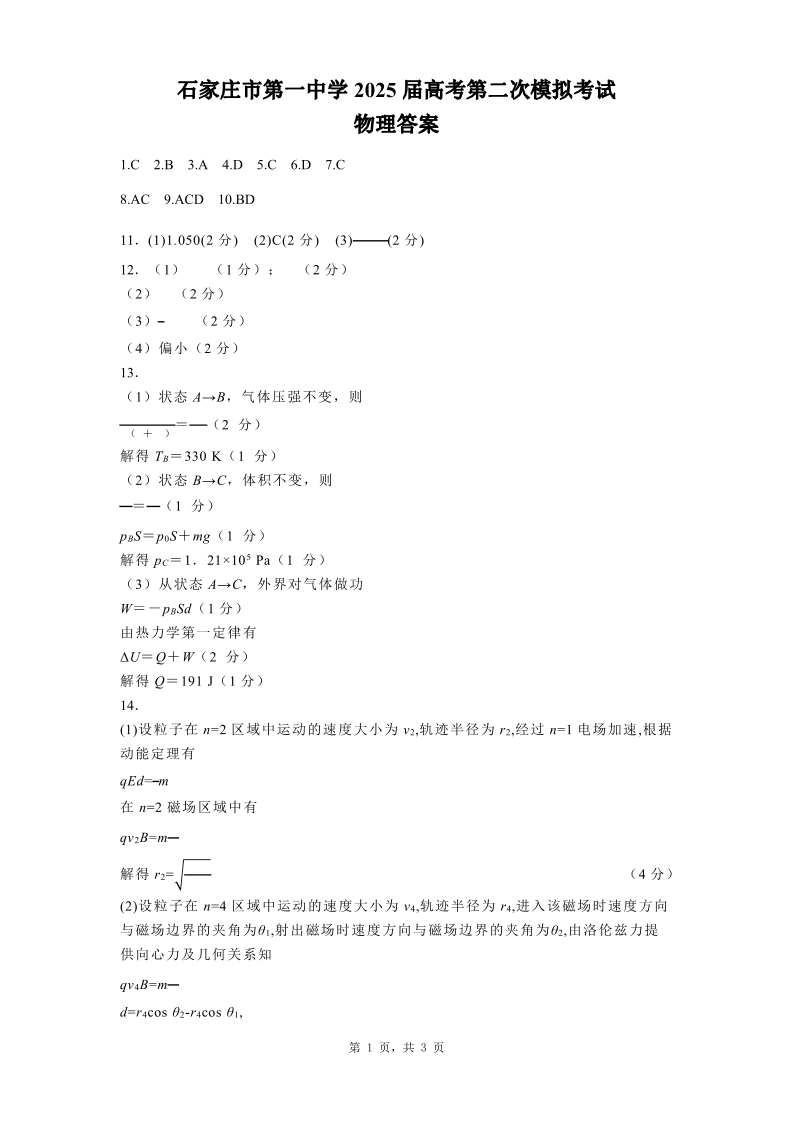 河北省石家庄市一中2024-2025学年下学期高三第二次模拟物理答案