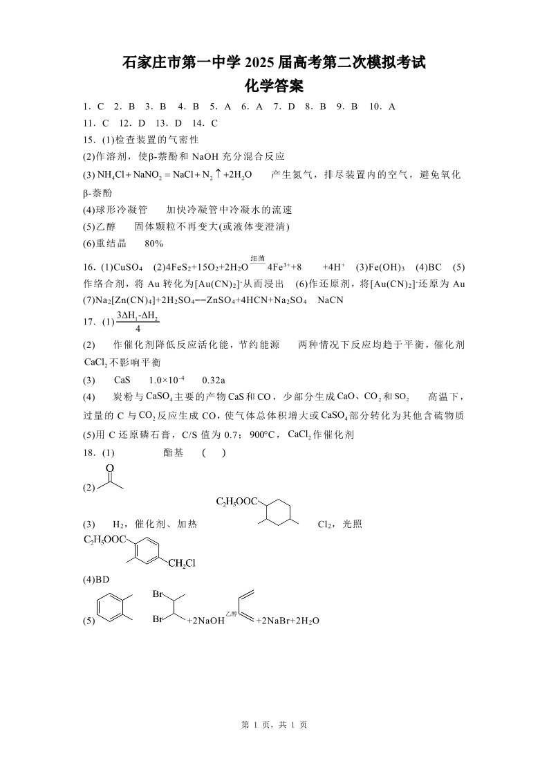 河北省石家庄市一中2024-2025学年下学期高三第二次模拟化学答案