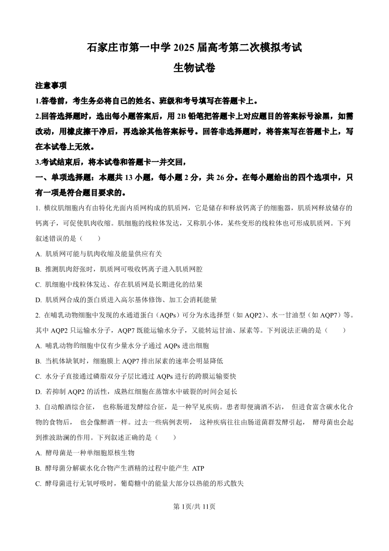 河北省石家庄市一中2024-2025学年下学期高三第二次模拟生物