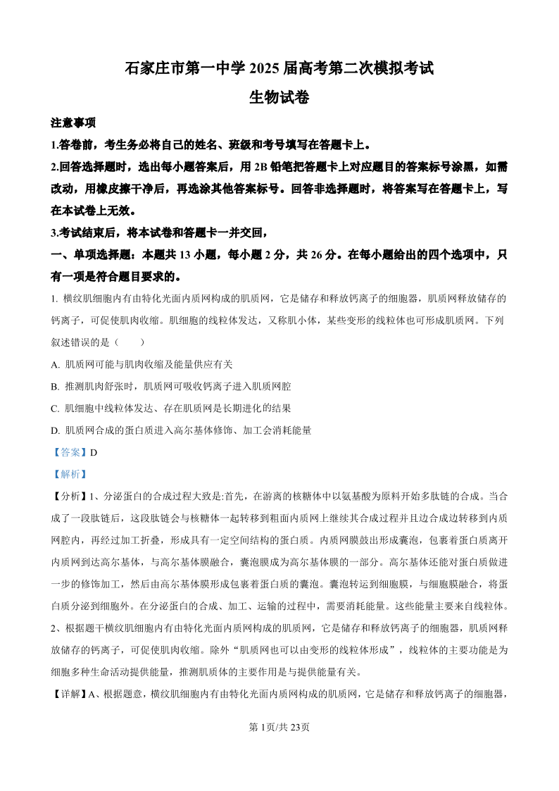 河北省石家庄市一中2024-2025学年下学期高三第二次模拟生物答案