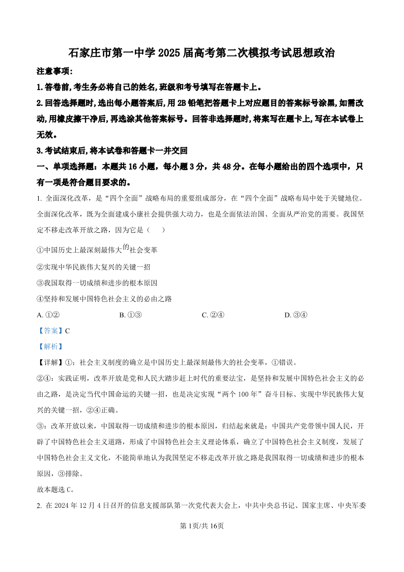河北省石家庄市一中2024-2025学年下学期高三第二次模拟政治答案