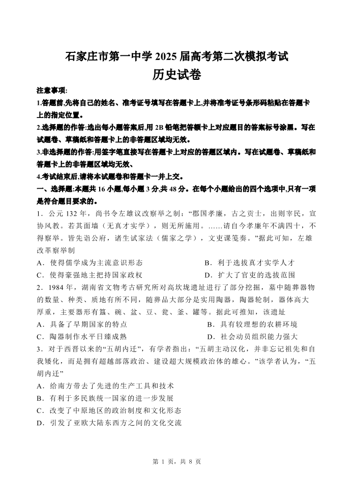 河北省石家庄市一中2024-2025学年下学期高三第二次模拟历史