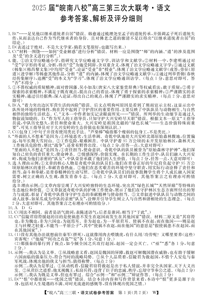 安徽省皖南八校2024-2025学年下学期高三第三次联考语文答案