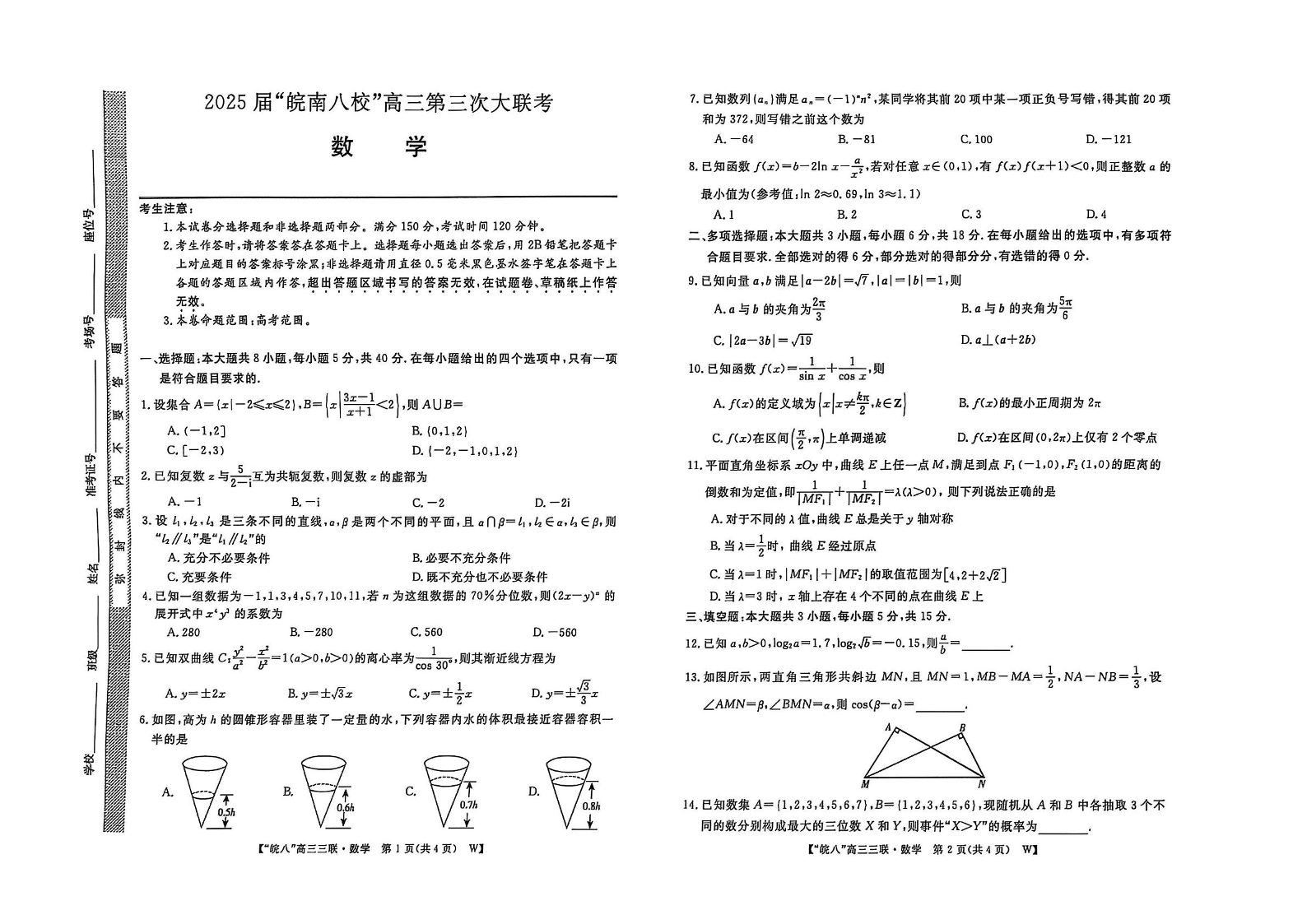 安徽省皖南八校2024-2025学年下学期高三第三次联考数学