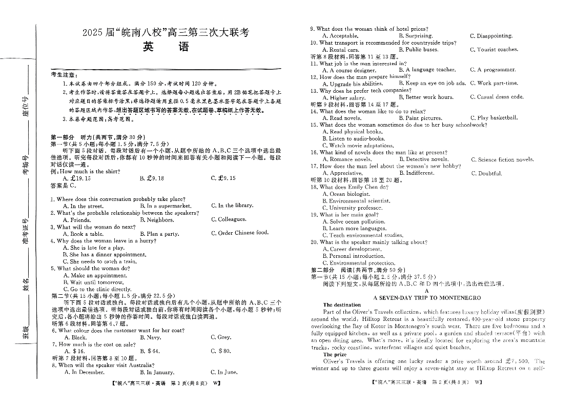 安徽省皖南八校2024-2025学年下学期高三第三次联考英语