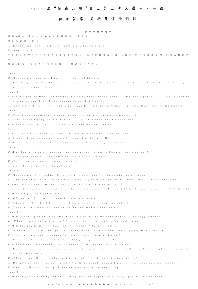 安徽省皖南八校2024-2025学年下学期高三第三次联考英语答案