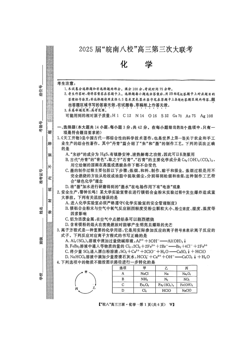 安徽省皖南八校2024-2025学年下学期高三第三次联考化学