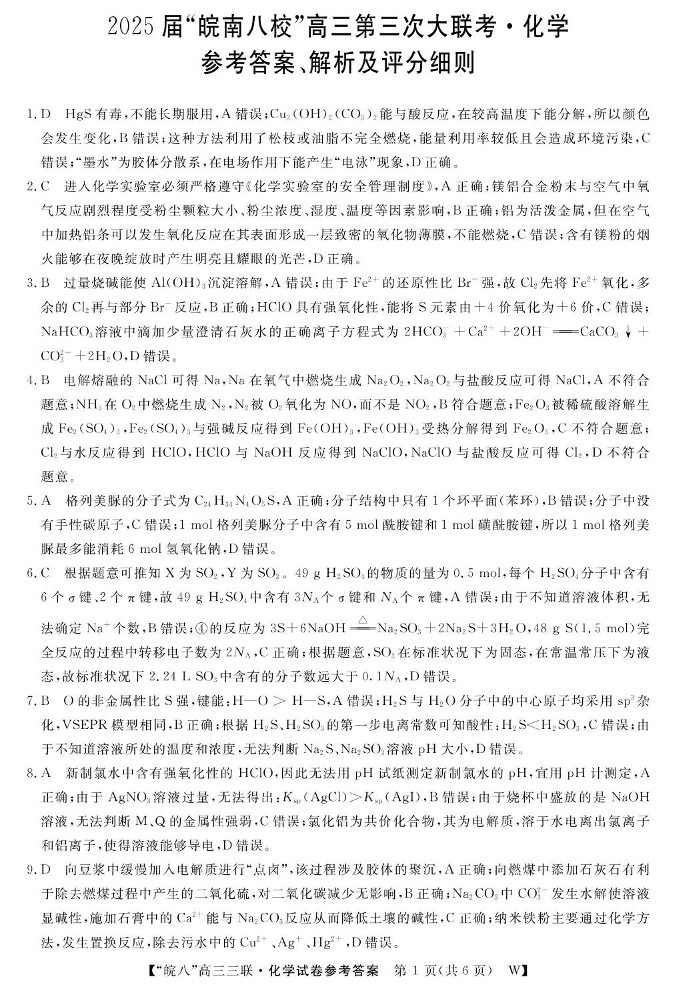 安徽省皖南八校2024-2025学年下学期高三第三次联考化学答案