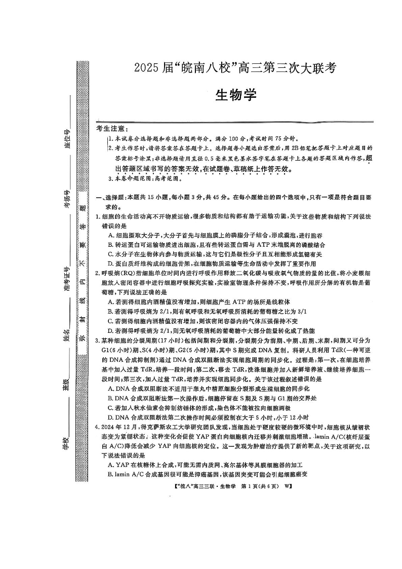 安徽省皖南八校2024-2025学年下学期高三第三次联考生物