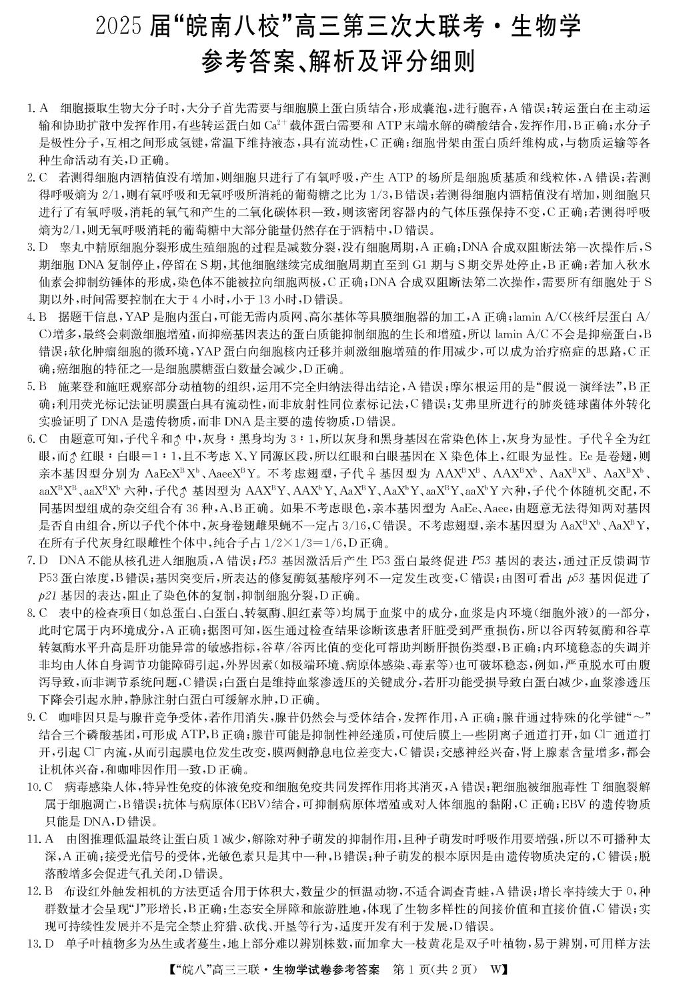 安徽省皖南八校2024-2025学年下学期高三第三次联考生物答案